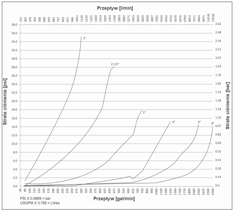 Na poniższym wykresie zaprezentowano zależność strat ciśnienia od wszystkich nominalnych rozmiarów dozownika (od DN50 do DN200) w zależności od nateżenia przepływu.