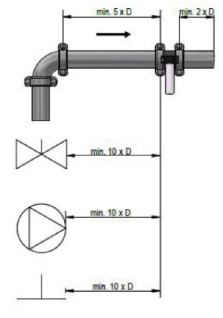 - Do instalacji zaworów, pomp lub rur z trójnikiem wymagana jest ścieżka wlotowa o długości co najmniej 10 x D. Z tego co najmniej