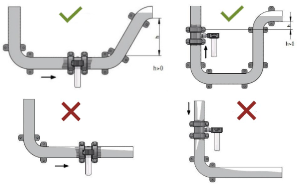- Rurociągi muszą być zawsze całkowicie wypełnione. Przykłady szczególnych sytuacji instalacyjnych są zilustrowane na poniższych rysunkach: