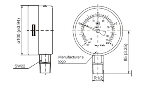 | Manometr glicerynowy | 0 - 25 bar / 0 - 350 psi | 848098 | 0,5 bar/10 psi | 0,9 (0,04) |