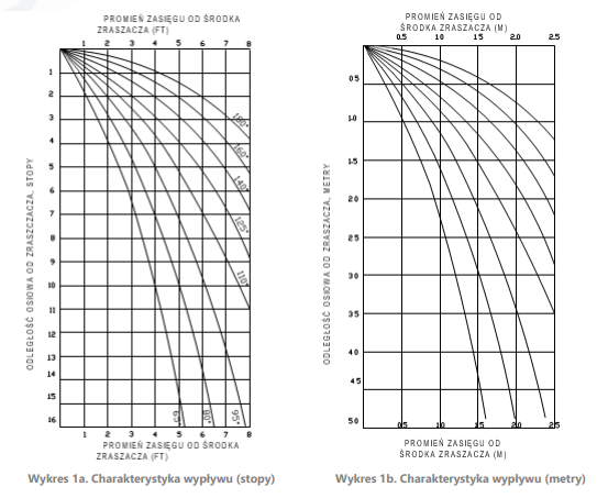 Kąt zraszania jest wartością określoną dla każdego zraszacza i jest wytłoczony na deflektorze. Wykresy 1a i 1b przedstawiają zasięg zraszania przy różnych wysokościach montażu zraszacza. Dane te uzyskano na podstawie testów zraszacza w pozycji wiszącej przy ciśnieniach zraszania 10, 20 i 60 PSI (0,7 bar, 1,4 bar i 4,1 bar). Należy zwrócić uwagę, że zraszacz model E jest przeznaczony do maksymalnego ciśnienia zraszania 175 PSI (12 bar). Przy ciśnieniach powyżej 60 PSI (4,1 bar) siła wypływu powoduje zmniejszenie zakresu rozdziału wody. W tabelach 2a, 2b i na wykresie nr 7 przedstawiono odległości zraszaczy o ustalonych wewnętrznych kątach charakterystyki wypływu do powierzchni obiektu zewnętrznego przy określonych kątach montażu.