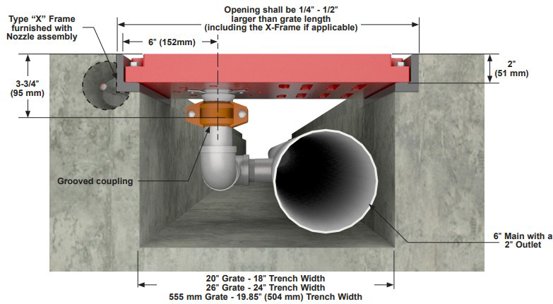 - Rurociąg doprowadzający musi znajdować się w kanale drenażowym. Rura zasilająca 2” powinna być poprowadzona poziomo od przewodu głównego w kanale, a następnie pionowo do dyszy. Zasilanie 2” musi kończyć się połączeniem rowkowym, umożliwiającym montaż do dyszy posadzkowej (patrz rys. 7.1.1.).