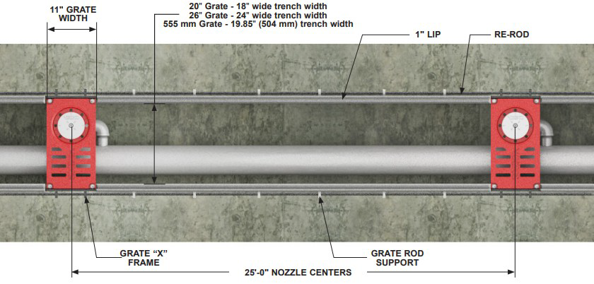 - Montaż zespołu dyszy posadzkowej wraz ze standardowymi kratkami odpływowymi wymaga zapewnienia odpowiednich wymiarów kanału drenażowego (patrz rys. 7.1.1.). Wielkość kanału powinna zostać określona przez architekta lub inżyniera projektu na wczesnym etapie i przed instalacją.